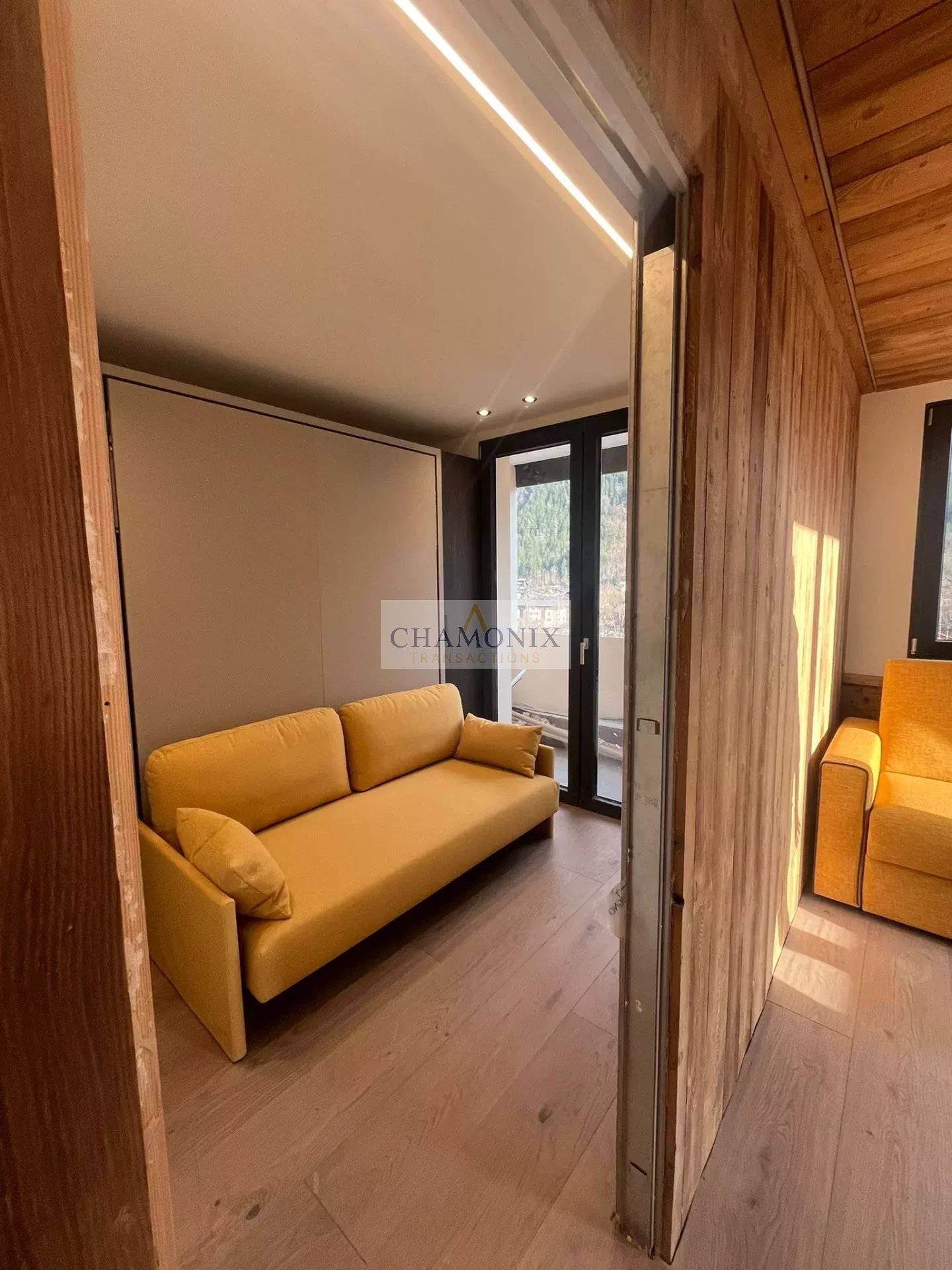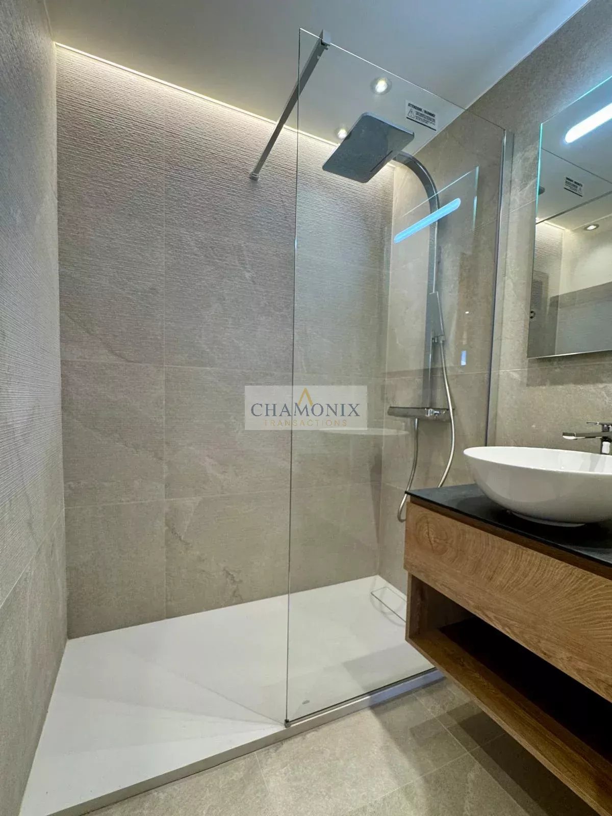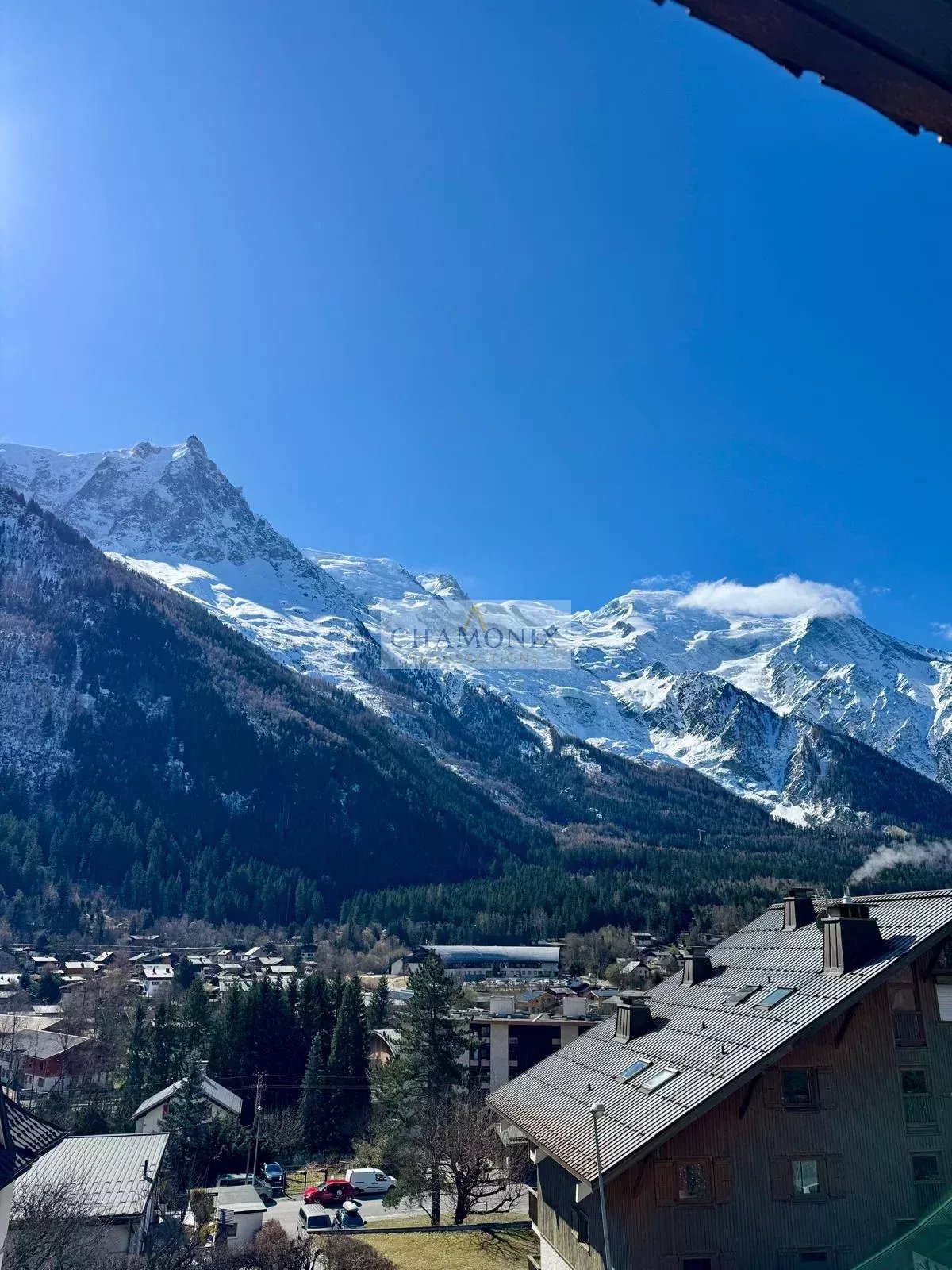 It comprises an entrance with storage, a fully equipped kitchen, a fitted sleeping area (“coin montagne”), a separate toilet, and a shower room. A separate bedroom with storage and a south-facing balcony complements the property, while the bright living room opens onto a balcony offering stunning views of the Mont Blanc massif.
