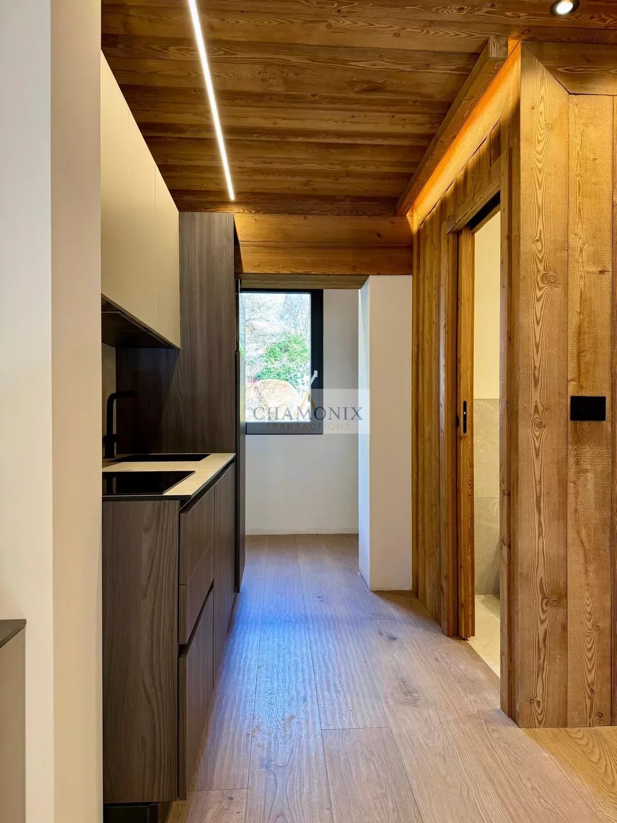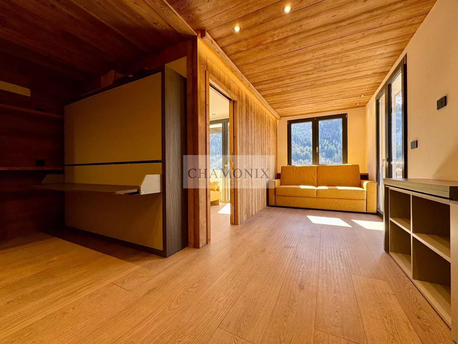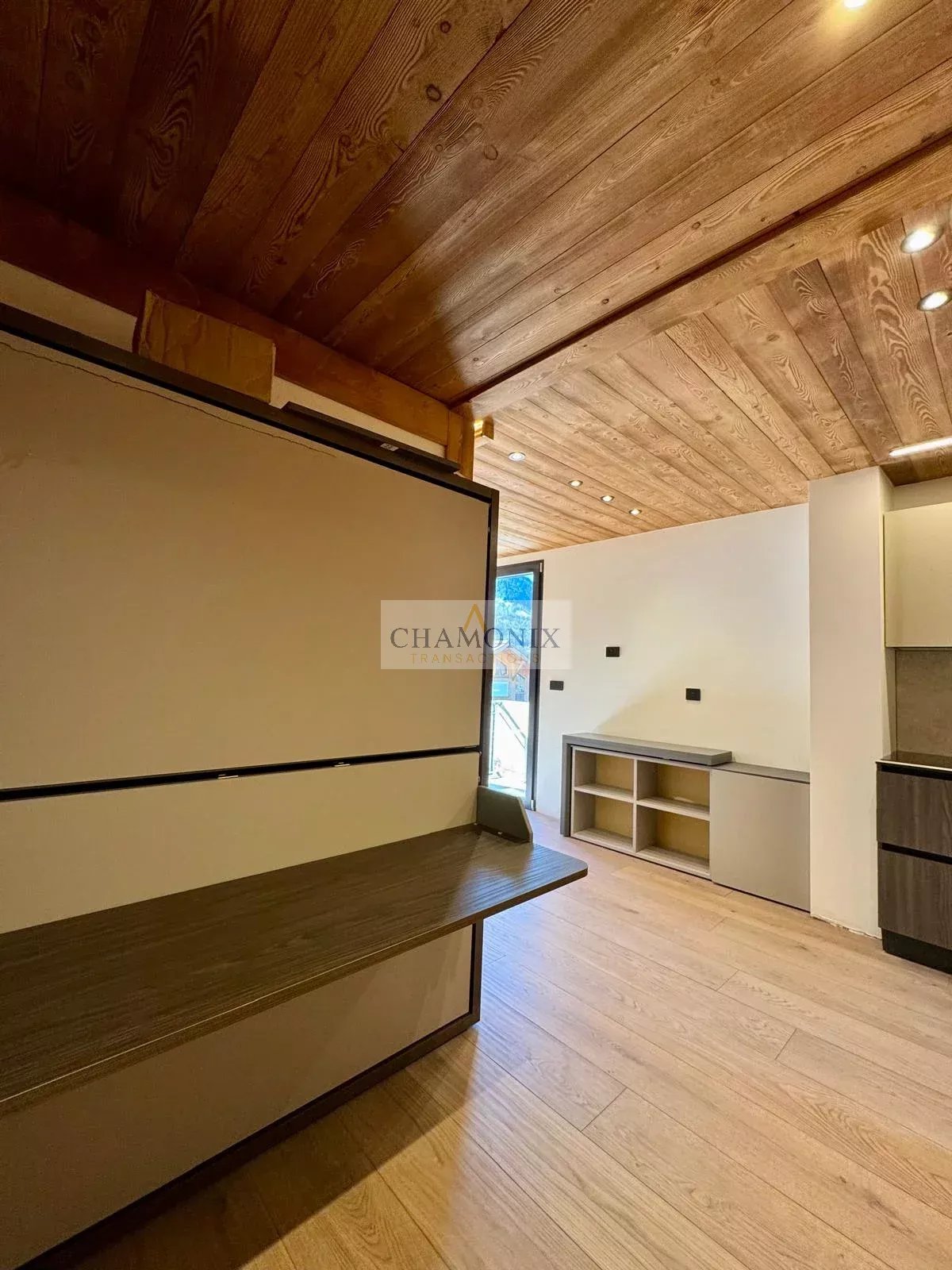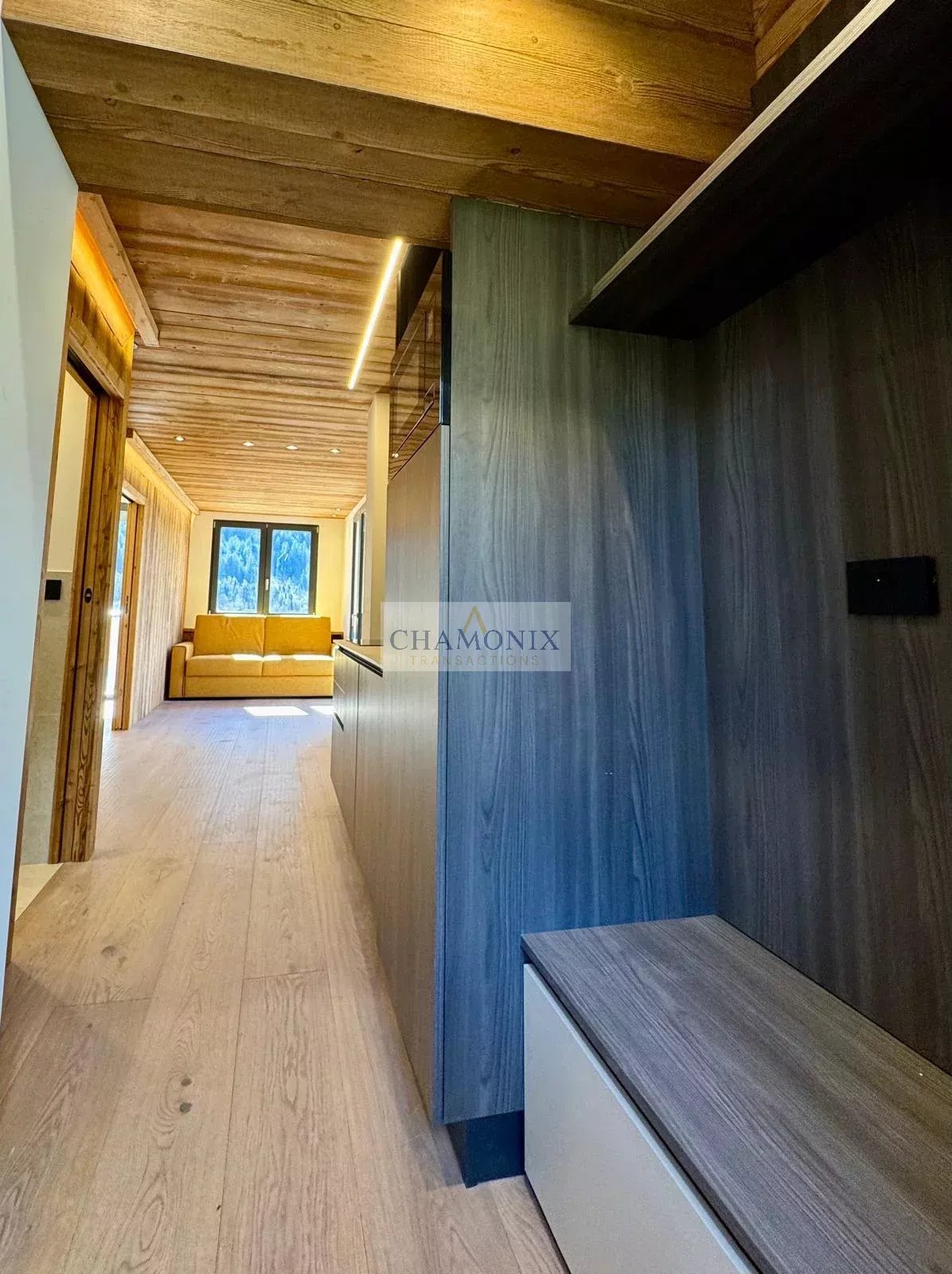 It comprises an entrance with storage, a fully equipped kitchen, a fitted sleeping area (“coin montagne”), a separate toilet, and a shower room. A separate bedroom with storage and a south-facing balcony complements the property, while the bright living room opens onto a balcony offering stunning views of the Mont Blanc massif.